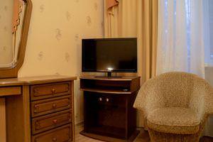 Номер студия двухместный однокомнатный, включает в себя: современный санузел, телевизор, холодильник, 2 односпальные кровати или одну двуспальную. На этаже находится кулер с горячей водой.