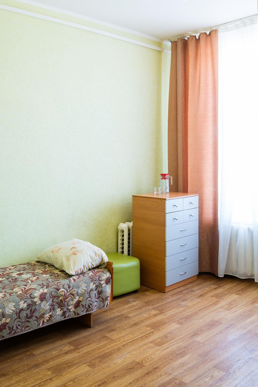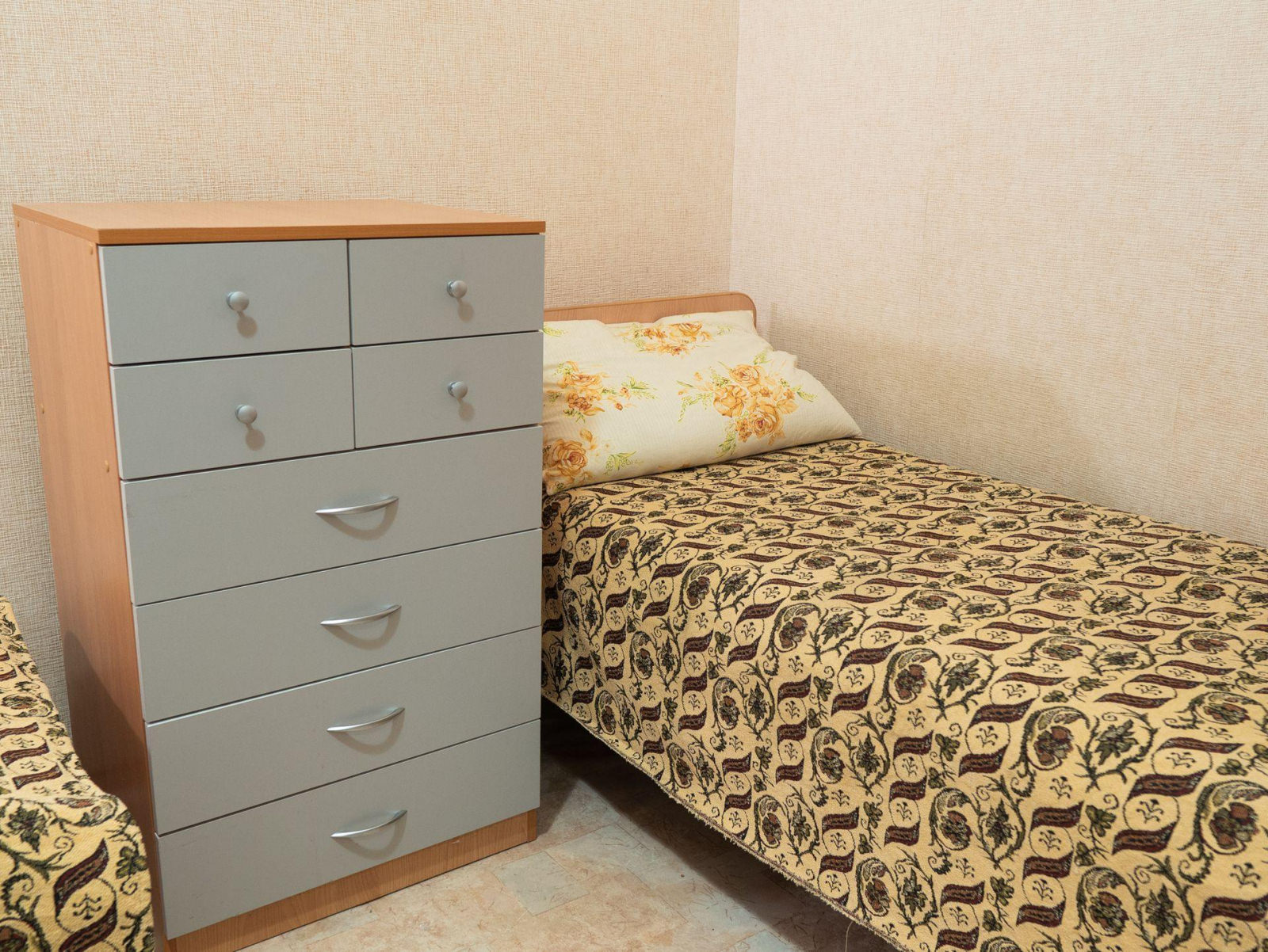 Трехместный номер стандарт, включает: холодильник, телевизор. Кулер с горячей водой на этаже. Душ и туалет общие на блок.